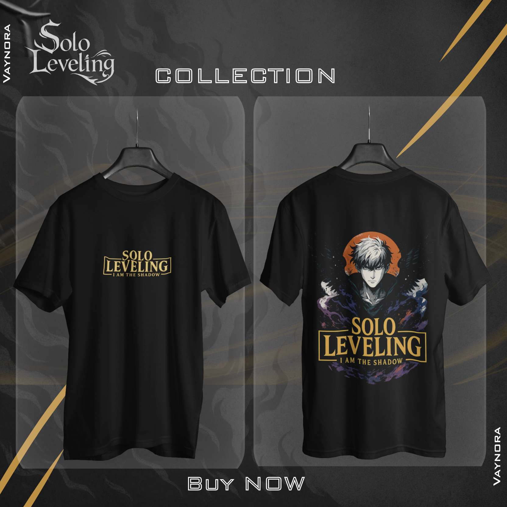 🌓 Front: Bold golden “Solo Leveling – I Am The Shadow” statement